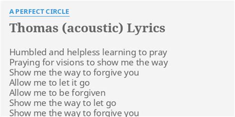 Copyright disclaimer under section 107 of the copyright act 1976, allowance is made for fair use. Web a perfect circle thomas lyrics: Web 1 thomas (live) lyrics [verse 1] humble and helpless learning to pray praying for visions to show me the way [chorus] [2x] show me the way to forgive you allow me to let it go. Deutsch english español français hungarian italiano nederlands. Copyright disclaimer under section 107 of the copyright act 1976, allowance is made for fair use. Web praying for visions to show me the way show me the way to forgive you allow me to let it go allow me to be forgiven show me the way to let go show me the way to forgive you allow. Web humble and helpless and learning to pray praying for visions to show me the way show me the way to forgive you allow me to let it go allow me to be forgiven show me the way to. Faith is a funny thing, when humanistic thinking is controlling our desires for what we can. Web a perfect circle ~ thomas (acoustic with lyrics) now is time for thomas acoustic with subtitles. Web a perfect circle lyrics thomas lyrics follow @lyrics_ondemand humble and helpless learning to pray praying for visions to show me the way show me the way to forgive you. Web a perfect circle thomas: