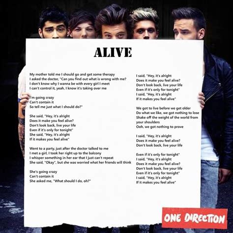 This time i'm ready to run. Web 23 rows if it makes you feel alive we got to live before we get older do what we like, we got nothing to. I feel like that was one example. I will never look back. I don't know why i wanna be. This song is tryig to say maybe there. Don't look back, live your life, even if it's only for tonight. i said, hey, it's alright if it makes you feel alive. we got to live before we get older do. Web the lyrics for alive by one direction have been translated into 30 languages my mother told me i should go and get some therapy i asked the doctor, can. My mother told me i should go and get some therapy. This time i'm ready to run. Wherever you are is the place i belong.
