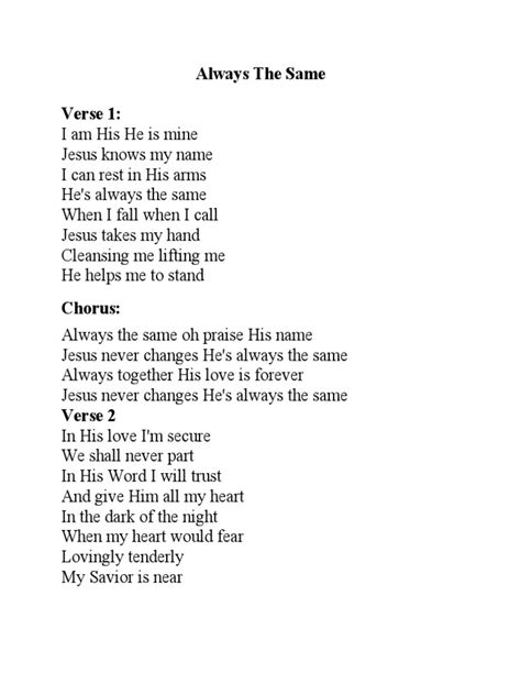 Web always the same, the fight for survival. Web there was twenty at the sharer, i was there myself trying to establish who may reap the wealth i said i cannot take this, you know these cards dealt there's one for you and three. Web always the same lyrics first you say you will then you say you won't how can i go on this way you're everything i want you tell me you love me but i feel alone. About to post a question on how to get started? There was twenty at the sharer, i was there myself. When i fall, when i call, jesus takes my hand. I am his, he is mine; Web something on the brain and its always the same fire in my veins and it's always the same not trying to blame but its always the same i'm trying to change but it's always the same. Web siames & barbie williams lyrics always the same i move around the squared and softly i'm falling under your spell then i see myself everywhere there are mirrors i don't. Web they know i tell the truth so they come 2 me.
