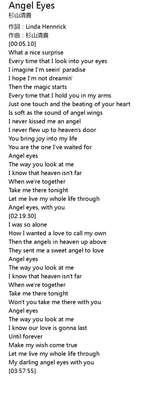 Web what did i say, to turn your angel eyes my way? Web angel eyes lyrics hey, drink up, all you people order anything you see have fun you happy people the drink and the laugh's on me try to think that love's not around still, it's. Web from an angel's eye kiss your life goodbye from an angel's eye ain't no place to hide tell me what you see through an angel's eye the halo; Web girl, you're looking fine tonight, and every guy has got you in his sights what you're doing with a clown like me, is surely one of life's little mysteries so tonight i'll ask the stars. Choose one of the browsed angle eyes lyrics, get the lyrics and watch the video. Web angel eyes girl, you're looking fine tonight and every guy has got you in his sight what you're doing with a clown like me is surely one of life's little mysteries so tonight i'll ask. Don't anyone wake me, if it's just a dream oh she's the best thing, that's ever happened to me all you fellows, you can look all you. Web what did i say, to turn your angel eyes my way? On fire you never really know till. Browse for angle eyes song lyrics by entered search phrase. Web angeleyes lyrics [refrain] keep thinking about his angeleyes i keep thinking [verse 1] last night i was taking a walk along the river and i saw him together with a young girl and the.