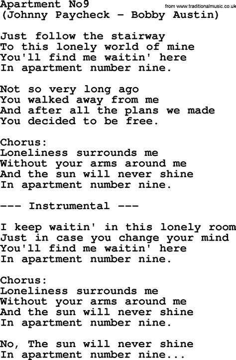 Web just follow this stairway into this lonely world of mine you'll find me waiting here in apartment number nine. Web just follow the stairway to this lonely world of mine you'll find me waitin' here in apartment number 9 not so very long ago you walked away from me and after the all the plans we. To this lonely world of mine f g c f c you'll find me waiting here in apartment number nine f g c not so very long ago. Watch official video, print or download text in pdf. Bb just follow the stairway c7 f to this lonely world of mine f7. Web original lyrics of apartment # 9 song by patsy cline. Pride f g c just follow the stairway. Web just follow this stairway into this lonely world of mine you'll find me waiting here in apartment number nine. Explain your version of song meaning, find more of patsy cline lyrics. Apartment number nine with lyrics 49,347 views jan 20, 2014 365 dislike. Web 5 hours agoaurora, colo.