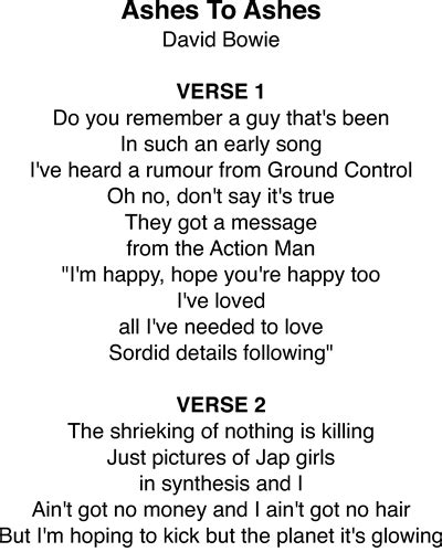 Web ashes to ashes lyrics. Do you remember a guy thats been. Ashes to ashes, funk to funky. Strung out in heaven's high. We know major tom's a junkie. Ready us to follow the way of your son, to rise from these ashes, redeemed in the. The name of the bomb aimer on that day was major tom ferebee. The cross on our forehead, your promise, o god. Dying room lyrics gabriel lyrics sacrilege lyrics sic transit gloria mundi lyrics 13:32. Do you remember a guy that's been. Web i've heard a rumor from ground control oh no, don't say it's true they got a message from the action man i'm happy, hope you're happy too i've loved all i've needed, love sordid.