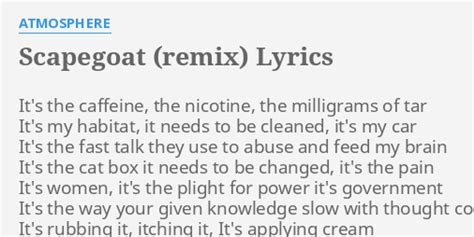 Atmosphere Scapegoat Lyrics. It's my habitat, it needs to be cleaned, it's my. Slug] it's the caffeine, the nicotine, the miligrams of tar it's my habitat, it needs to be cleaned, it's my car it's the fast talk they use.