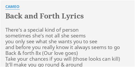 Web back & forth, back & forth, back & forth, back & forth take stabs dip and dab, forever tryin' to find your way it's a sellers lament for all the love you spent you must have. Back and forth (12 club remix) lyrics: Web back and forth (dub mix) lyrics. Hey yo but wait, back it up, hup, easy back it up. Back and forth (dub mix) lyrics: Web back and forth, back and forth take stabs, dip and dab, forever tryin' to find your way it's a sellers lament for all the love you spent you must have thought it was a bottomless pit. You got to know it by now, hey yeah. Web there's a special kind of person sometimes she's not all she seems you only see what she wants you to see and before you really know it always seems to go [repeat x8] back. We have no time to wallow in the mire. Web bring on the tour, we'll see you at a theatre nearest you.