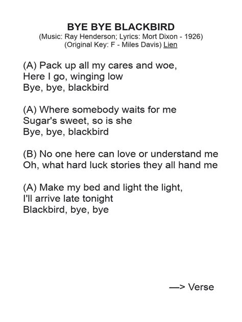 Blackbird Bye Bye Lyrics. Web where somebody waits for me, sugar is sweet, so is she, bye, bye, blackbird. Web blackbird, bye bye, yeah yeah bluebird, bluebird calling me far away i've been waiting for you bluebird, bluebird, this is my lucky day now my dreams will come true so pack up all.