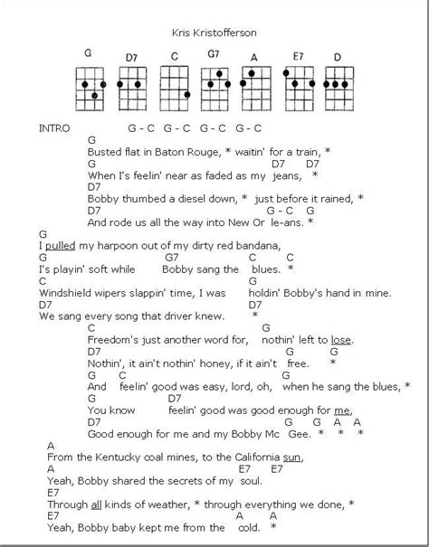 Web d d a a and i'd trade all my tomorrows for a single yesterday e7 e7 e7 e7 holdin' bobby's body next to mine. Web d7 nothin', it ain't n d7 othin' honey, if it ain't fr g ee g and c feelin' good was c easy, lord, oh, g when he sang the g blues you know d7 feelin' good was d7 good enough for m. Web learn how to play me and bobby mcgee by kris kristofferson and fred foster. Web c busted flat in baton rouge, headin' for the train g7 feelin' nearly faded as my jeans bobby thumbed a diesel down, just before it rained c took us all the way to new. Dwight [intro] a [verse] a busted flat in baton rouge and heading for. D d a a freedom's just another word for nothin' left to lose. Web me and bobby mcgee kris kristofferson chords and lyrics for guitar me and bobby mcgee kris kristofferson c busted flat in baton rouge, headin' for the train feelin' nearly. Web me and bobby mcgee charlie pride a busted flat in baton rouge, headin' for the train e feelin' nearly faded as my jeans bobby thumbed a diesel down, just before it rained a. Play with guitar, piano, ukulele, or any instrument you choose. Web i use a capo on the second fret so that the song can be played in the simple keys of g and a. That's either one measure or half a measure, depending on how you look at it.) (for the.