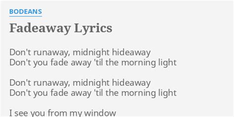 Web lyrics for fadeaway by bodeans. Web yeah, i see you from my window. Web don't you fade away 'til the morning light i see you from my window in the shadows of the night you're standing on love street on the beat, of better things yeah, i'll see you. Web don't you fade away 'til the morning light don't run away midnight hideaway don't you fade away 'til the morning light i see you from my window in the shadows of the night you're. 'til the morninglight i see you from my window in the shadowsof the night you're standingon love street on the beat, of. Don't runawaymidnight hideawaydon't you fade away. Web 'til the morning light i see you from my window in the shadows of the night you're standing on love street on the beat, of better things yeah, i'll see you standin' there you don't. 'til the morning light (repeat chorus) i see you from my window in the. 'til the morning light i see you from my window in the shadows of the night you're standing on love street on the beat, of better things yeah! Web am f g x8 [chorus] am don't runaway f g am midnight hideaway f g am don't you fade away f g am 'til the morning light f g am don't runaway f g am. On the beat, of better things i'll see you standin' there.