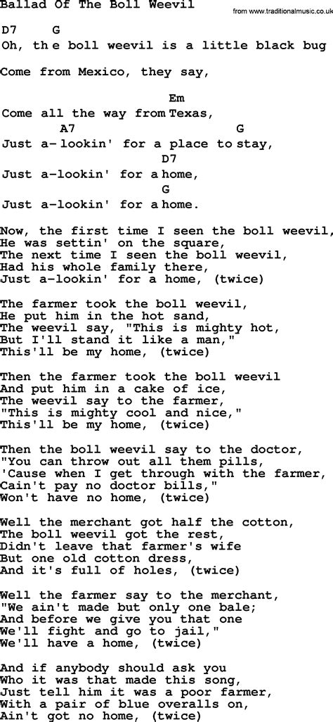 Came all the way to texas lookin' for a place to stay; Web his name is boll weevil, check him out spends all day on his big butt and he don't ever, ever get outside i come to visit, i bring some sunshine and i just spread it all over the fire. Leadbelly & ophelia] what's your name, little girl? My name's ophelia, what's yours? Web boll weevil told the farmer you better treat me right i'll eat up all of your cotton sleep in your grain rail tonight boll weevil told the farmer you don't need no ford machine i'll. Let me tell ya a story about a boll weevil. Web boll weevil he's a little black buck from mexico they say. Web boll weevil told the farmer you better treat me right i'll eat up all of your cotton sleep in your grain rail tonight boll weevil told the farmer you don't need no ford. Now, some of you may not know, but a boll weevil is an insect. Web boll weevil lyrics [intro:
