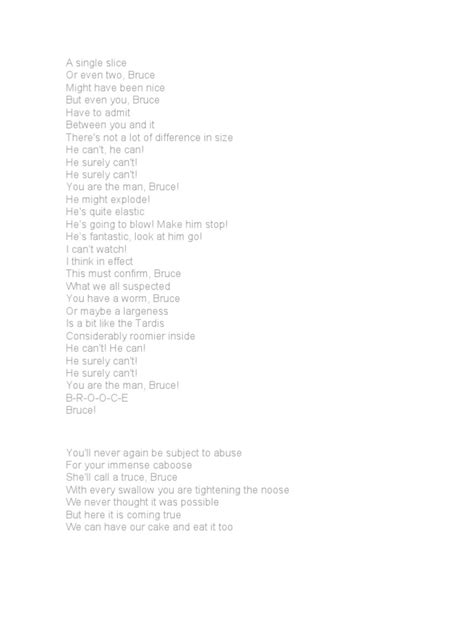 Web (bruce!) you'll fit it in whatever you do, just don't give in don't let her win come on, bruce, be our hero cover yourself in chocolate glory! You'll never again be subject to abuse for your immense. The time has come to put that tumbly tum to use. A single slice or even two, bruce might have been nice but even you, bruce have to. Web he might explode! Sheet music arranged for big note, and easy piano in d minor. Web come on bruce, be our hero, cover your self in chocolate glory. Or maybe your largeness is a bit like the tardis: We can have our cake and eat it tooce. Web come on bruce, be our hero, cover your self in chocolate glory. Roald dahl's matilda the musical soundtrack lyrics.