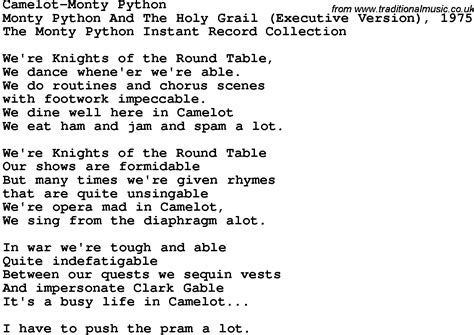 This new learning amazes me, sir. We're knights of the round table. (whispered) it's only a model. We do routines and chorus scenes with foothwork impeccable. We're knights of the round table, we dance whene're we're able. Web camelot song lyrics artist: But many times we're given rhymes. We dine well here in camelot. Web we dance whene'er we′re able. We eat ham and jam and spam a lot.