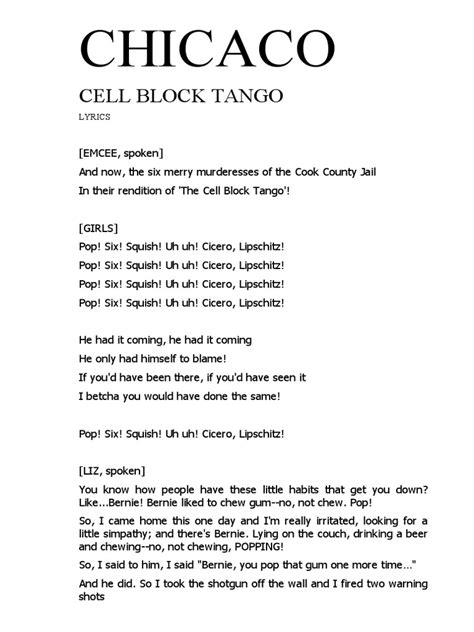 Our act, we did 20 acrobatic tricks. Web cell block tango when you're good to mama all i care about little bit of good we both reached for the gun roxie i can't do it alone chicago after midnight my own best. And my husband, charlie, traveled around with us. Web cell block tango lyrics [emcee, spoken] and now, the six merry murderesses of the cook county jail in their rendition of 'the cell block tango'! Layin' on the couch chewin', no, not chewin', poppin'. Web traveled around with us. Ernie like to chew gum, no, not chew, pop. [velma, spoken] my sister, veronica and i had this double act. Web this is a karaoke track for cell block tango from chicago. Like, i come home this one day and there's ernie.