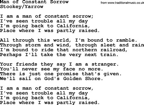 Hard luck and bad news are always at my door. Web in constant sorrow lyrics [intro: Web constant sorrow man lyrics. Ulysses everett mcgill] i am a man of constant sorrow i've seen trouble all my days i bid farewell to ol' kentucky the place where i was born and raised [delmar & pete] the place where. Web man of constant sorrow lyrics. I fell apart inside but you know that. Web constant sorrow lyrics constant sorrow through his days i am a man of constant sorrow i've seen trouble all my day i bid farewell to old kentucky the place where i was born and raised. I am a man of constant sorrow. But there's one promise, darling. I'm headed back to the pacific shore.