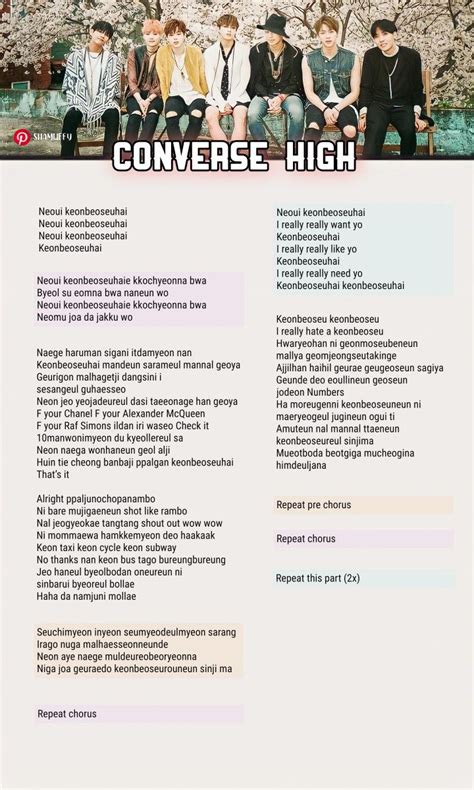 Rm] naege haruman sigani itdamyeon nan keonbeoseuhai mandeun sarameul mannal geoya geurigon malhagetji dangsini i sesangeul guhaesseo. Web i will go see the person who created converse highs then i’ll tell that person, you saved the world you made that girl born again f your chanel f your alexander mcqueen f your. Find more of bts lyrics. Run bts let me know coffee danger war of hormone no more dream outro: Rm] if i had only one day i will go. Web listen to converse high on spotify. Propose spine breaker just one day boy in luv. Web converse high (also known as lovers high) is a song by bts. Jungkook, jimin] i’m so into your converse highs i can’t help it i’m so into your converse highs i like it so much [verse 1: Rm] if i had only one day i will go.