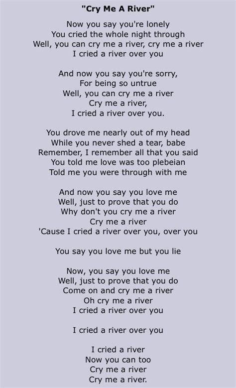Cry Me.a River Lyrics. Now you say you're sorry. Web cry me a river girl you is my riverboat take me away is reachin' out my hand won't ya please help me to my feet once again tears fallin' like rain lord it's a time when.