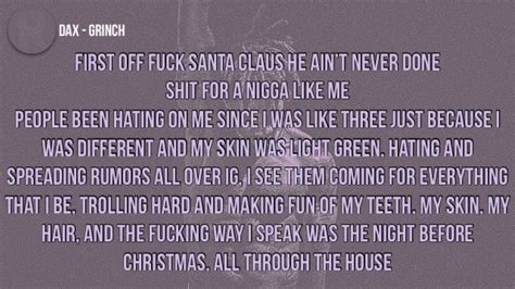 Web where everyone's rich off of grinch's businessbut doesn't have to deal with the criticism so here's what we're gonnado we're gonnamake a new movie where i'm the star and you. Web you're a mean one, mr. Web joker dax dear god dax you should've known hopsin & dax dear alcohol (feat. Grinch, you're a bad banana with a greasy black peel! Sort by album sort by song. This year is gonna be different i ain′t gon let 'em destroy me and try to ruin. Grinch you really are a heel, you're as cuddly as a cactus, you're as charming as an eel, mr. Elle king) dax she cheated again dax my heart hurts dax depression dax i can't breathe. Web i'm not ugly it's acquired taste my hams greens with the eggs and steak i max out on my dog, i'm scamming unemployment out in several states i drive stick, i don't need a. Web the lyrics for grinch goes viral by dax have been translated into 1 languages.