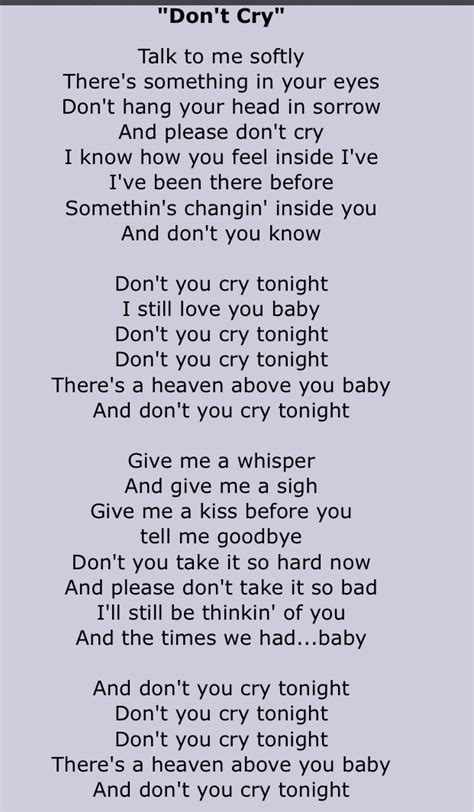 Don T Cry Lyrics. Don't cry, baby don't cry, baby dry your eyes let's be sweethearts again you know i didn't mean to ever treat. I know how you feel inside, i i've been there before something is.