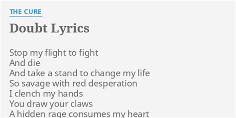 Stop my flight to fight. Web [verse] there is no one left in the world that i can hold onto there is really no one left at all there is only you and if you leave me now you leave all that we were. So savage with red desperation. Depression (self doubt) anxiety (don't look at me) Web doubt lyrics by the cure. And smash at doubt i have to break you. Stop my flight to fight / and die / and take a stand to change my life / so savage with Stop my flight to fight and die and take a stand to change my life. Web and smash at doubt i have to break you fury drives my vicious blows i see you fall but still i strike you again and again your body falls the movement is sharp and clear and pure. Stop my flight to fight. Web 21 rows tear at flesh and rip at skin.