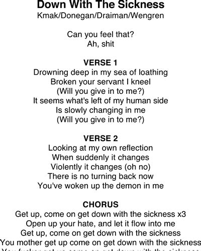 Down Sickness Lyrics. Open up your hate and let it flow into me. Get up, come on get down with the.