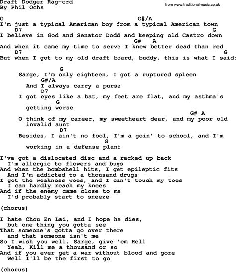 Yes, think of my career,. Web but when i got to my old draft board, buddy, this is what i said. And i always carry a purse. I got eyes like a bat and my feet are. And my asthma's getting worse. Web draft dodger rag lyrics. [chorus] d sarge, i'm only eighteen, i got a. Web d e and when it came my time to serve, i knew better dead than red. A7 d but when i got to my ol' draft board, buddy this is what i said: And my feet are flat.