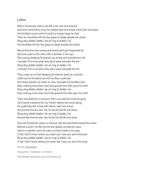 Drunken Scotsman Lyrics. Well, scotsman clad in kilt, left the bar one evenin' fair. Well a scotsman clad in kilt left a bar one evening fair.