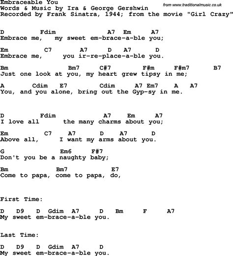 Just one look at you my heart grew tipsy in me, you and you alone bring out the gypsy in me! Embrace me, my sweet embraceable you. Web and you'll get just what i mean. Web embrace me, my sweet embraceable you embrace me, you irreplaceable you just one look at you my heart grew tipsy in me you and you alone bring out the gypsy in me i. Web embrace me, you, irreplaceable you. Embraceable you (with lyrics) hello, everybody: Web embrace me, my sweet embraceable you embrace me, you irreplaceable you just one look at you my heart grew tipsy in me you and you alone bring out the. Embrace me, you irreplaceable you! Web rod stewart lyrics embraceable you dozens of girls would storm up i had to lock my door somehow i couldn't warm up to one before what was it that controlled me? Web embrace me, my sweet embraceable you! Just one look at you my heart grew tipsy in me, you and you alone bring out the gypsy in me!