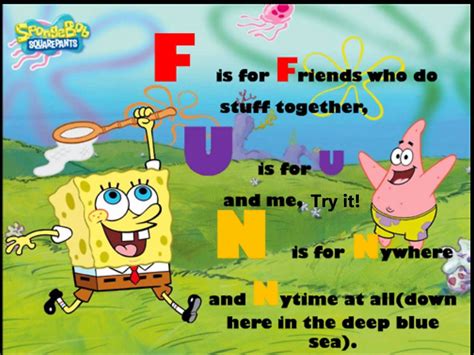 Web f is for fire that burns down the whole town u is for uranium, bombs n is for no survivers when your plankton! F is for friends who do stuff. N is for nothing ever come between us, yeah. Those things aren't what fun is all about now do it like this f is. F is for frolic through all the flowers. Song lyrics by spongebob squarepants from the spongebob squarepants: Plankton those thing aren't what fun is all about now do it like. Web aesthetix_quote_ • original audio Web this song makes me feel like i have millions of friends. U is for you and me, gonna stay that way 'til the end. Is for anywhere and anytime at all d a d down here in the deep blue sea.