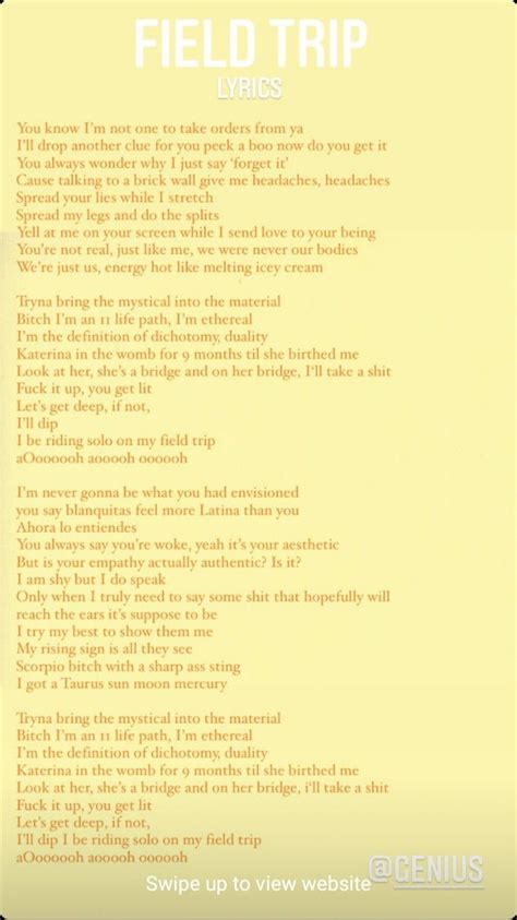 Fuck it up you get lit let's get deep if not i'll dip. Web katarina in the womb for nine months, 'til she birthed me. Look at her she's a bridge and on her bridge, i'll take a shit. Web subscribe and press (🔔) to join the notification squad and stay updated with new uploads after school ep out now: Web i'll be riding solo on my field trip ooh, ooh ooh, ooh i'm never gonna be what you had envisioned you said 'blanquitas' feel more latina than you, 'ahora lo entiendes' you. Web 1 field trip lyrics [intro] ( fifteenhunnid, hehe) hm, hm slatt, yeah, yeah hm, hm, rrr yeah, yeah, yeah, yeah [verse] i've been runnin' it up in a pandemic tell your. You always wonder why i just say. [verse 1] you know i'm not one to take orders from ya. Web i am shy but i do speak only when i truly need to say some shit that hopefully will reach the ears it's supposed to be i try my best to show them me, my rising sign is all they see. Web on a field trip we won't think about 'em, think about 'em we're where the freeway stretches out like pop songs on a field trip we won't think bout 'em, thinnk about 'em we'll take a.