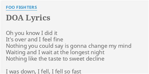 Foo Fighters Doa Lyrics. Web yeah, you know i did it it's over and i feel fine nothing you can say is gonna change my mind waited, and i wait at the longest night nothing like the taste of sweet decline Web ain't no way, doa ain't no way, doa take a good hard look for the very last time the very last one in a very long line only took a second to say goodbye been a pleasure, but the.