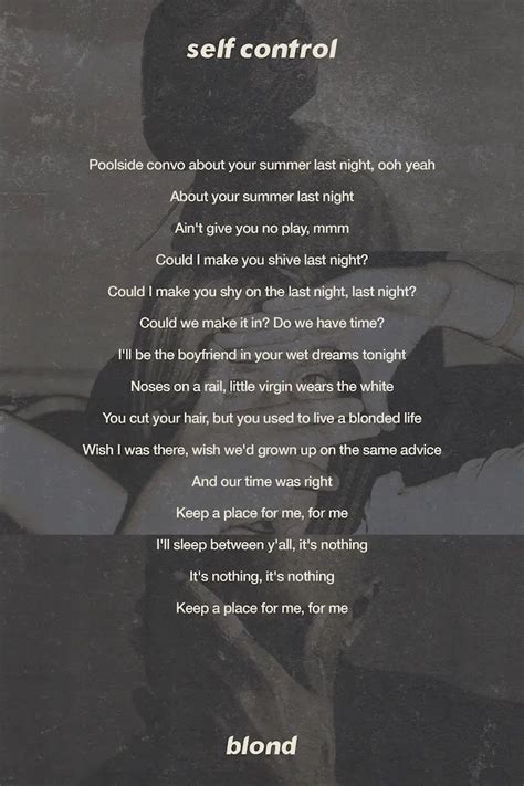 Frank Ocean Self Control Lyrics. Frank ocean] i'll be the boyfriend in your wet dreams tonight noses on a rail, little virgin wears the white you cut your hair but you used to live a blonded life wish i was. It's quite alright to hate me now.