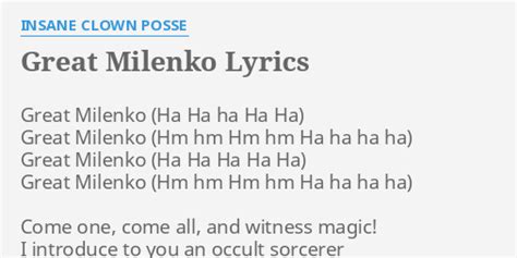 Great Milenko Lyrics. Great milenko (ha ha ha ha ha)great milenko (hm hm hm hm ha ha ha ha)great milenko (ha ha ha ha ha)great milenko (hm hm hm hm ha ha. Web the great milenko is the fourth studio album by american hip hop group insane clown posse, released on june 24, 1997 by hollywood records in association with.