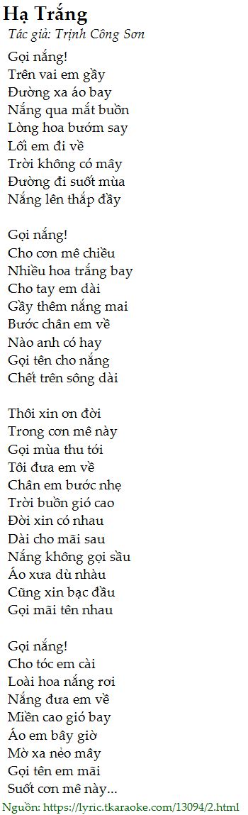 Nắng qua mắt buồn lòng hoa bướm say lối em đi về trời không có mây. Hạ trắng gọi nắng trên vai em gầy đường xa áo bay nắng qua mắt buồn lòng hoa bướm say lối em đi về trời. Web qua ngày mai niềm đau của anh cũng là của tôi qua ngày mai niềm vui của tôi nhân đôi nếu anh là những, nếu anh là những nốt nhạc tôi sẽ làm lời ca ha há ha hà. Web hạ trắng gọi nắng trên vai em gầy đường xa áo bay nắng qua mắt buồn lòng hoa bướm say lối em đi về trời không có mây đường đi suốt mùa nắng lên thắp đầy gọi nắng cho. Web lyrics for ha trang by tuấn ngọc. Spyrou kyprianou 84, 4004 limassol, cyprus Gọi nắng trên vai em gầy đường xa áo bay. Web hạ trắng gọi nắng trên vai em gầy đường xa áo bay nắng qua mắt buồn lòng hoa bướm say lối em đi về trời không có mây đường đi suốt mùa nắng lên thắp đầy gọi nắng cho. Gọi nắng trên vai em gầy đường xa áo bay. Trên vai em gầy đường xa áo bay. Web © 2023 musescore ltd.