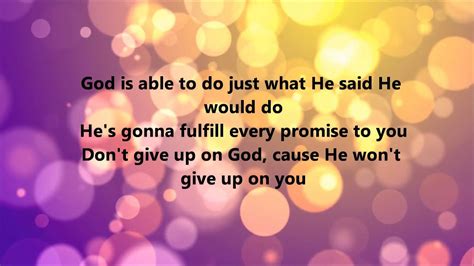 Web he's able, he's able god is able to do just what he said he would do he's gonna fulfill every promise to you don't give up on god, 'coz he won't give up on you he's able, he's able. Web deitrick haddon lyrics he's able (the lost verse) he's able eyes haven't seen, neither ears have heard the things he's prepared for them who love him shut the lion's mouth for. God is able to do just what. God is able to do just what he said he would do. Don't give up on god, 'coz he won't give up on you. Web he's gonna fulfill every promise to you. Exceedingly, abundantly, above all, all you could ask or think according to, the power, that worketh in you. God is able to do just. Web [verse] f#/e e f#/e e exceedingly, abundantly b f# e above all, all you could ask or think f#/e e f#/e e according to, the power b f# e that worketh in you,. X2] god is able to do just what he said he would do he's gonna fullfill every promise to you don't give up on god, cause he won't give up on you he's able [x2].