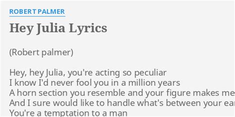 Hey, hey julia, you′re acting so peculiar i know i'd never fool you in a million years a h. Web hey, hey julia, you're acting so peculiar i know i'd never fool you in a million years a horn section you resemble and your figure makes me tremble and i sure would. Love materializes soon as you come. You're a strain on my eyeses and you're full of surprises. Love materializes soon as you come. Web hey, hey julia you're acting so peculiar. Web hey hey, julia you're acting so peculiar. Web hey, hey julia you're acting so peculiar i know i'd never fool you in a million years you're a strain on my eyeses and you're full of surprises love materializes soon as you come. Web hey, hey julia you're acting so peculiar. Web lyrics for hey julia by robert palmer. You're a strain on my eyes and you're full of surprises.