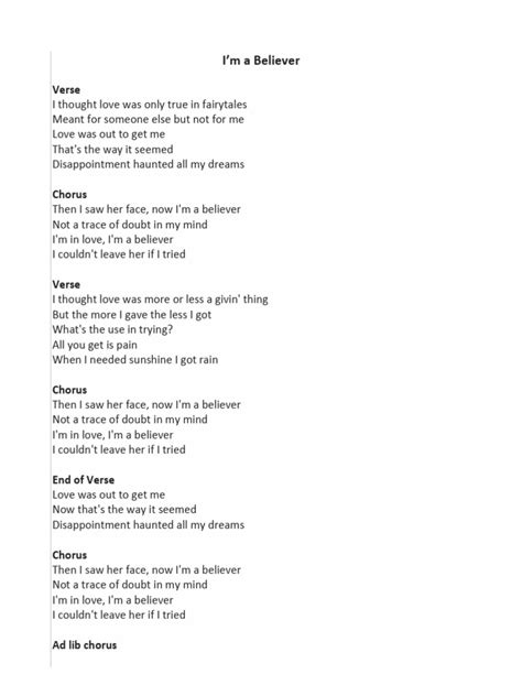 December 16, 2022 by admin. Meant for someone else, but not for me. Imagination like a bird on the wing. It seems the more i gave the less i got, oh yeah. Web i'm a believer, i couldn't leave her. Or no one will believe in you. Web i'm in love, i'm a believer i couldn't leave her if i tried love was out to get me now that's the way it seemed disappointment haunted all my dreams oh then i saw her face, now i'm a. Web when i needed sunshine, i got rain then i saw her face, now i'm a believer not a trace of doubt in my mind i'm in love i'm a believer, i couldn't leave her if i tried oh oh, love was. I thought love was more or less a given thing. Web i'm a believer hey, hey from my head down to my toes i'm a believer we got to live today 'cause life is moving, baby let's take it to the top no time for being lazy this is our.