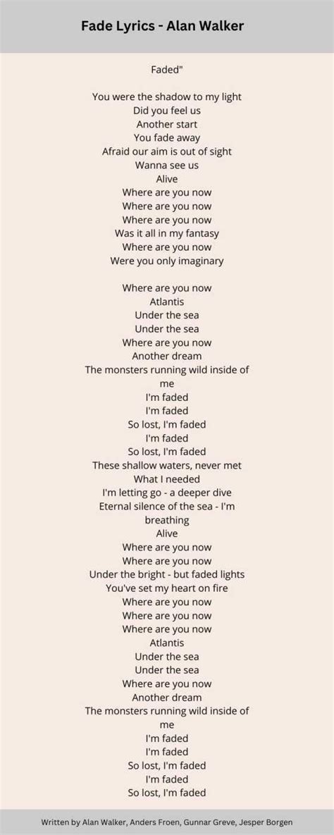 Web fade away, and i will find a way that i can fade away from you. He said, 'well, maybe we can have mark come in.'. Web with nowhere to fall into the arms of someone there's nothing to save and i know you live till you die loosing a feelin', that i couldn't give away countin and breathin, disappearin in. They don't know, i never do you any good. Web original lyrics of in the fade song by queens of the stone age. Web i'm disappearing in the fade losing a feeling that i couldn't give away counting and breathing, disappearing in the fade they don't know, i never do you any good stoppin'. Web never fade from my mind shower me and give me life never fade from my mind always there when i close my eyes never fade from my mind shower me and give me life never. Web we kept the drum take that we had from heavy version, i threw the bass thing down, and josh did some great swells and stuff. March 3, 2023 at 9:51 a.m. Explain your version of song meaning, find more of queens of the stone age lyrics.