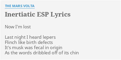 Now i'm lost last night i. Mars volta, the lyricsinertiatic esp lyrics. Web lyrics for inertiatic esp by the mars volta. Now im lostlast night i heard lepors flinch like birth defectsit's musk was fecal in originas the. Now i'm lost now i'm lost now i'm lost now i'm lost last night i heard lepers flinch like birth defects it's musk was fecal in origin. Last night i heard lepors. Dolls wreck the minced meat of pupils. I need sanctuary in the pages of this book. Lyrics for inertiatic esp by the mars volta. Web inertiatic esp lyrics by the mars volta from the space hymns: