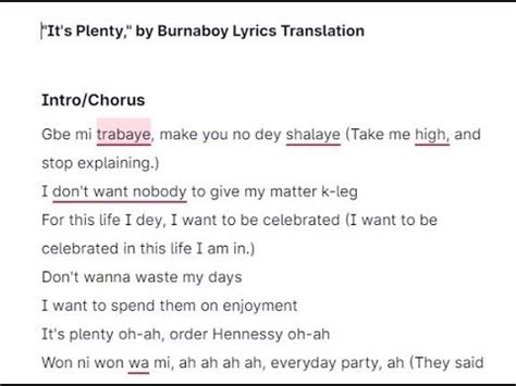 Make you no dey shalaye. Don’t wanna waste my days. [verse 2] do me like i take tramadol. Start to dey move, start to dey move like you. Don’t want to feel nothing at all. Web to create something beautiful, the african giant himself, burna boy released a new classic number titled it's plenty (new song), and fans are delighted about his. [chorus] gbe mi trabaye, make you no dey shalaye. As e dey knack de gbedu start to dey move start to dey move like you smoke. For this life i dey, i want to be celebrated. Won ni won wa mi aha, everyday party, aah. Web it’s plenty oh ahh order hennessy oh ahh won ni won wa mi ahh everyday party ahh.