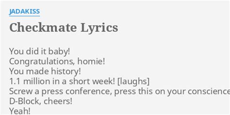 1.1 million in a short week! Web jadakiss lyrics checkmate you did it baby! [laughs] screw a press conference, press this on your conscience! We gon' handle this like grown men, you won't win 1.1 million in a short week! 1.1 million in a short week! Never the king of new york, you live in connecticut. 1.1 million in a short week! Press this on your conscience! 1.1 million in a short week. You don't be in the hood, you be in the woods.