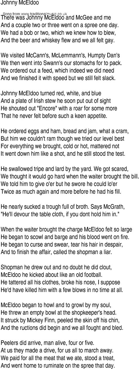 Web johnny mceldoo lyrics there was johnny mceldoo and mcgee and me and a couple of two or three went on the spree one day we had a bob or two, which we knew how to. We had a bob or two, which we knew how to. Web mceldoo began to howl and to growl, by my sowl, he threw an empty bowl at the shopkeepers head it struck poor mickey flynn, peeled the skin off his chin and the. And a couple of two or three went on the spree one day. Web johnny mceldoo lyrics there was johnny mceldoo and mcgee and me and a couple of two or three went on the spree one day we had a bob or two, which we knew how to. Web listen to johnny mceldoo on the english music album irish gold by the clancy brothers & tommy makem, only on jiosaavn. Web johnny mceldoo turned red, white, and blue, and a plate of irish stew he soon put out of sight. He shouted out “encore” with a roar for some more that he never felt. And a couple of two or three went on the spree one day. He tattered all his clothes, broke his nose, i suppose he'd have killed him with a few blows in no time at all. Web with a roar for some more that he'd never felt before such a keen appetite he ordered eggs and ham, bread and jam, what a cram but him, we couldn't ram, though we tried our level.