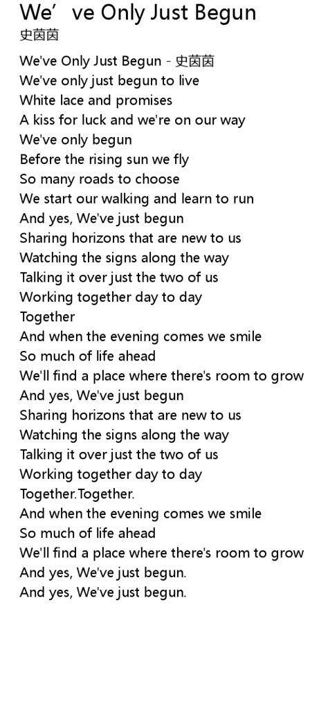 Just Begun Lyrics. Honestly i’m taking it as it comes. Web we've only just begun to live white lace and promises a kiss for luck and we're on our way we've only begun before the rising sun we fly so many roads to choose we start out.