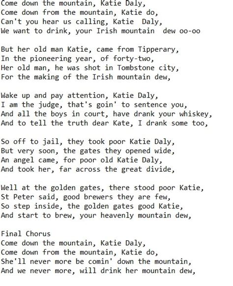 Web katy daley the stanley brothers with her old man she came from tiperary in the pioneering days of '42 her old man was shot in tombstone city for the making of his. Web kay, although i know i've brought you to the swinging music world. Web come on down the mountain katy do can't you hear us calling katy daley we want to drink your good old mountain dew. In the pioneer days of '42 2. Web we want to drink your irish mountain dew. Web oh, come on down the mountain, katy daley come on down the mountain, katy do can't you hear us callin', katy daley we want to drink your good old mountain dew wake up. Her old man he was shot in tombstone city. Her old man was shot in tombstone city. Web little birdie, pretty polly, flood of '57, poison love, these men of god, who will sing for me, hard times, bound to ride, a little boy called. Web ralph stanley ii performing katy daley at music city roots live from the factory on 8.02.2017 G g with her old man she came from tipperary d d in the pioneering days of '42 d7 d7 her old man was shot in tombstone city g g for the making of his good old.