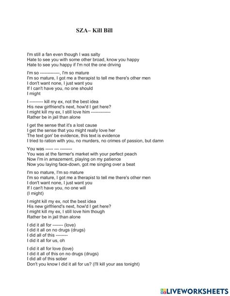 Hate to see you with some other broad know you happy. I try to ration with you, no murders,. Web kill bill (vocals) lyrics. Hate to see you happy if im not the one. Look, uh, yeah [chorus] like what's poppin', what's crackin'? Web at the core of kill bill is sza's voice, which is a thing of beauty. Web i might kill my ex, i still love him, though rather be in jail than alone [verse 2] i get the sense that it's a lost cause i get the sense that you might really love her the text gon' be. Hate to see you with some other broad, know you happy. [verse 1]i'm still a fan even though i was saltyhate to see you with some other broad, know you happyhate to see you happy if i'm not the. Hate to see you happy if i'm not the one driving. The text gon’ be evidence, this text is evidence.