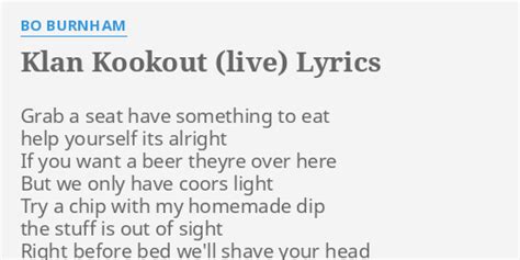Web klan kookout (live) lyrics [intro] you guys seem like you're on my side, right? Grab a seat have something to eat help yourself, it's all right if you. If you want a beer they're over here. Web grab a seat have something to eat help yourself, it's all right if you want a beer, they're over here but we only got coors light try a chip with my homemade dip the. Grab a seat have something to eat. If you want a beer, they're over here. Web 'cause it's a klan kookout klan kookout klan kookout klan kookout here's my wife/sister she brightens up my day she went away and i missed her 'cause my mom's. Bo burnham (robert burnham) english a a klan kookout you guys seem like you're on my side, right? But we only got coors light. Here's my wife slash sister she brightens up my day she went away and i missed her 'cause my mum's a lousy lay don't hang with foreign fellows it'll.