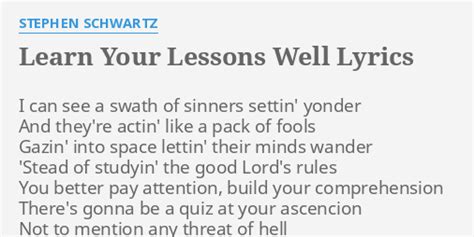 Web learn your lessons well lyrics, godspell, i can see a swath of sinners settin' yonder and they're Gazin' into space lettin' their minds wander, 'stead of studyin' the good lord's rules. [socrates] i can see a swath of sinners settin' yonder. Gazin' into space they let their minds all wander. 'stead of studyin' the good lord's rules. Learnin' ev'ry line and ev'ry last commandment may not help you, but it couldn't hurt. And they're actin' like a pack of fools. Ev'ry bright description of the promised land meant, you can reach it if you keep alert. You better pay attention, build your comprehension, there's gonna be a quiz at your ascension. You better pay attention, build your comprehension, there's gonna be a quiz at your ascension.
