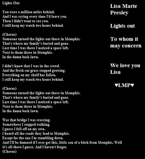 Lights Out Lyrics. That's where my family's buried and gone. I still keep my watch two hours behind.