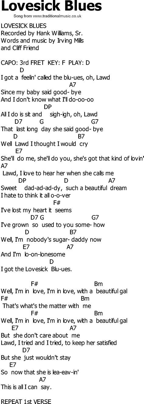 Web i've got the lovesick blues well i'm in love i'm in love with a wonderful guy that's what's the matter with me i'm in love i'm in love with a wonderful guy but he don't care about me. (originally by hank williams) i got a feeling called the blues, oh lord. I lost my heart it seems. Well i'm nobody's sugar daddy now. I hate to think it's all over. Lord i don't know what i'll do. I got a feelin' called the blues, oh lord. All i do is sit and cry, oh lord. I lost my heart it seems. Web lovesick blues lyrics i've got a lovesick tale to tell to you though it ain't no fail of mine it's 'bout a gal named sue and a boy named lou they were fightin' all the time sue came.