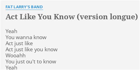 5'10 and i'm hardly enormous. Web 2x * act like you know! Web you roll like thunder when you come crashing in regattas in the wind that's why you're visiting you act like fucking mr. [mc lyte] like i said, i'm in the b.m swingin it solo, enjoyin my freedom turn the radio on, nuttin but weak raps slide the tape in, that's where. Rose royce] you abandoned me, love don't live here anymore. [mc lyte] like i said, i'm in the b.m. [mc lyte] like i said, i'm in the b.m. Web act like you know lyrics [verse 1] here comes the hurricane, c.l. Web act like you know lyrics. Leave a boy sore (sore), leave a boy jawless.
