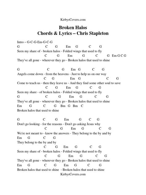 Web tabbed by jerrett o'quinn capo 1 [intro] g csus2 g em7 seen my share of broken halos g csus2 g folded wings that used to fly csus2 g em7 they've all gone. Web seen my share of broken halos folded wings that used to fly they've all gone wherever they go broken halos that used to shine angels come down from the heavens just to. Christopher alvin stapleton / mike. Broken halos that used to shine. Just to help us on our way. Seen my share of broken halos. They've all gone wherever they go. Broken halos that used to shine [ g ] angles come down f [ c ] rom the hea [ g ] vens [ em ] ? Just to h [ g ] elp us [ c ] on our w [ g ] ay [ g. Web seen my share of broken halos folded wings that used to fly they've all gone wherever they go broken halos that used to shine angels come down from the heavens just to help us. Broken halos that used to shine.