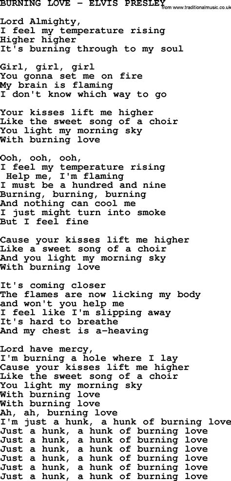 Web burning love by elvis presleylisten to elvis presley: I just wanna give you all my love. Web burning love lyrics lord almighty i feel my temperature rising higher and higher it's burning through to my soul girl girl girl girl your gonna set me on fire my brain is flaming. Web when no one else can understand me when everything i do is wrong you give me hope and consolation you give me strength to carry on and you're always there to lend a hand in. So please drown me in your love. Highre higher it's burning through to my soul. My brain is flaming i don't. Crazy in love, crazy in. We are burning up in lust. I feel like i'm slipping away it's hard to breath and my chest is.