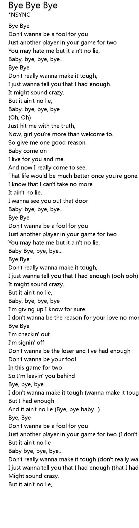 Lyrics Bye Bye Bye. Web mariah carey lyrics bye bye this is for my peoples who just lost somebody your best friend, your baby, your man or your lady put your hand way up high we will never say. I know this can't be right.